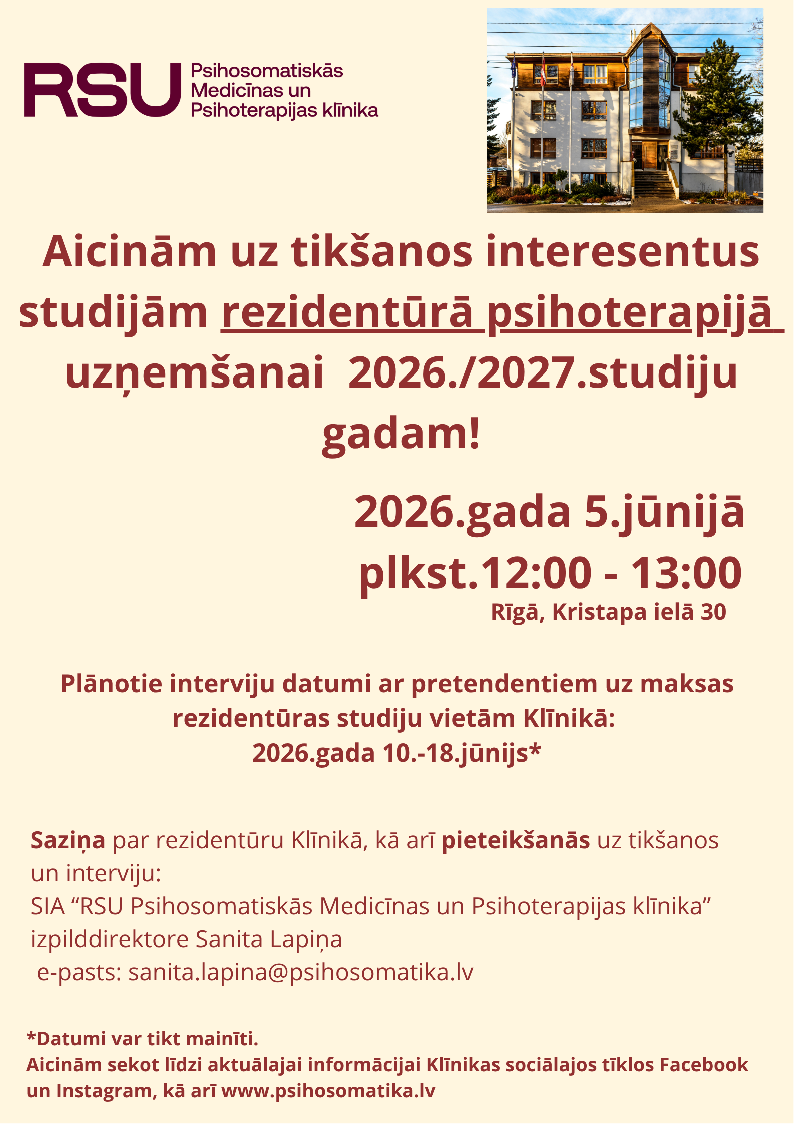 Aicinām rezidentūras psihoterapijā interesentus uz tikšanos 5.jūnijā! Aicinām rezidentūras psihoterapijā interesentus uz tikšanos 5.jūnijā!23. aprīlis, 2026ZiņasSaistītās ziņas Dr.Gļeba Troščenkova grāmata "About Human Goodness" - pārdošanā ASVLepojamies!, Ziņas Aicinām sievietes uz iegurņa apzināšanās un sievišķās meditācijas nodarbībām fizioterapeites vadībā piektdienās Rīgā, Kristapa ielā 30Ziņas Bālinta grupas ārstniecības un ārstniecības atbalsta personāmZiņas Atskats uz Ēnu dienu!Ziņas Klīnikas ārsti piedalās Rīgas Stradiņa universitātes "Zinātnes nedēļā 2025" Lepojamies!, Ziņas